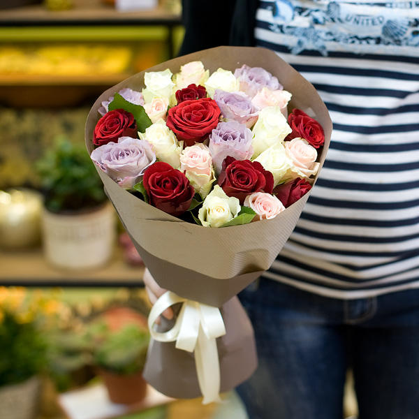 Букет из 25-ти разноцветных кенийских коротких роз в бумаге крафт. Доставляется по москве и Санкт Петербургу.