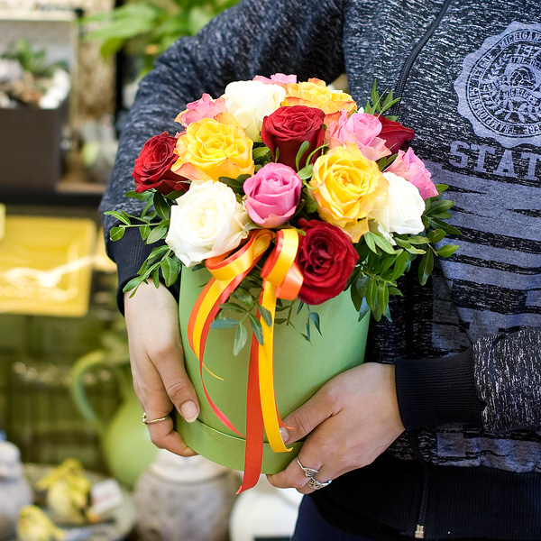 Разноцветная роза кения в шляпной коробке с декоративной зеленью. Доставляется по Москве и Санкт-Петербургу.