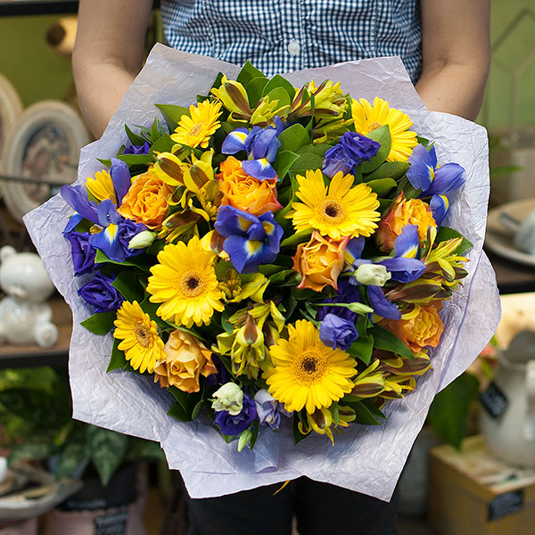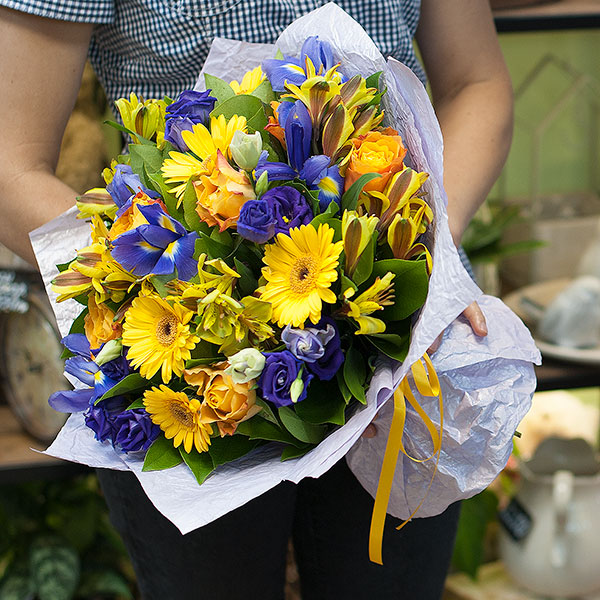 Букет в желто-синих тонах из минигербер, ирисов, лизиантусов, роз, альстромерии с декоративной зеленью в жатой бумаге крафт. Доставляется по Москве и Санкт-Петербургу.