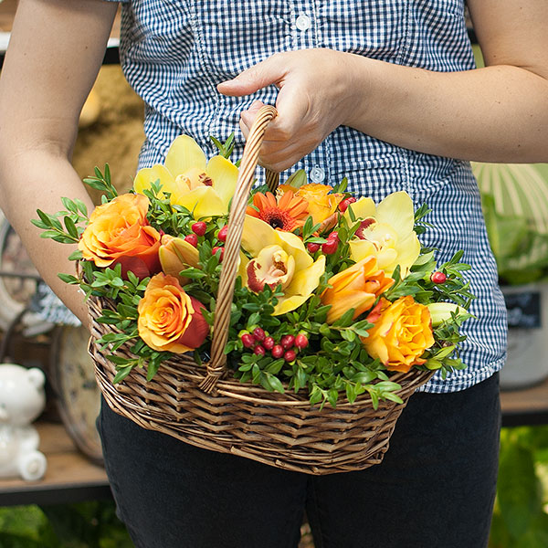 Корзина в желто-оранжевых тонах из желтой орхидеи цимбидиум, минигерберы, красного гиперикума, кеннийских роз, азиатской лилии с зеленью в корзине. Доставляется по Москве и Санкт-Петербургу.