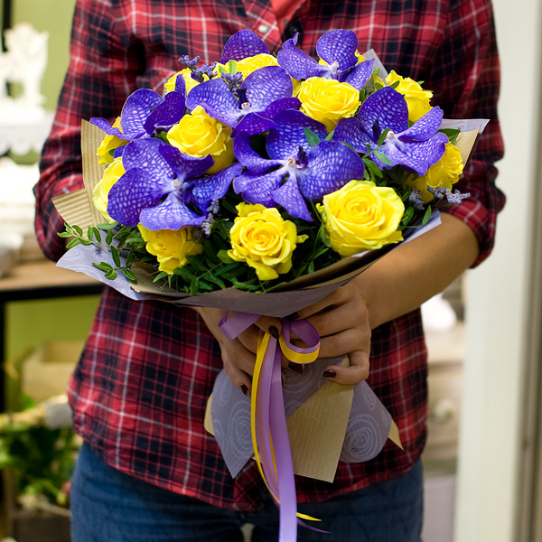 Букет в желто-синих тонах из желтых роз и синих орхидей сорта Ванда. Доставляется по Москве и Санкт-Петербургу.