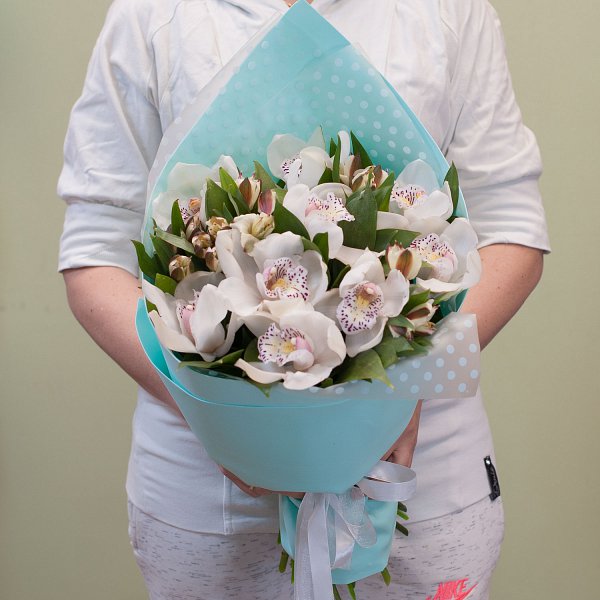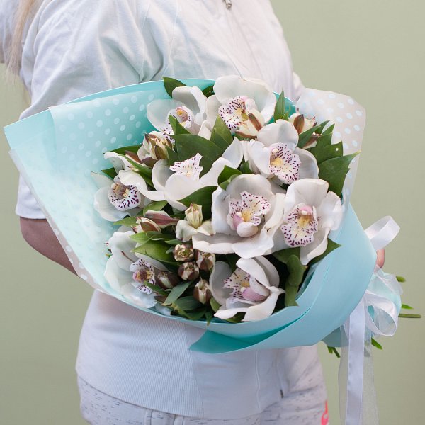 Букет из белых орхидей, белой альстромерии с декоративной зеленью в дизайнерской упаковке.