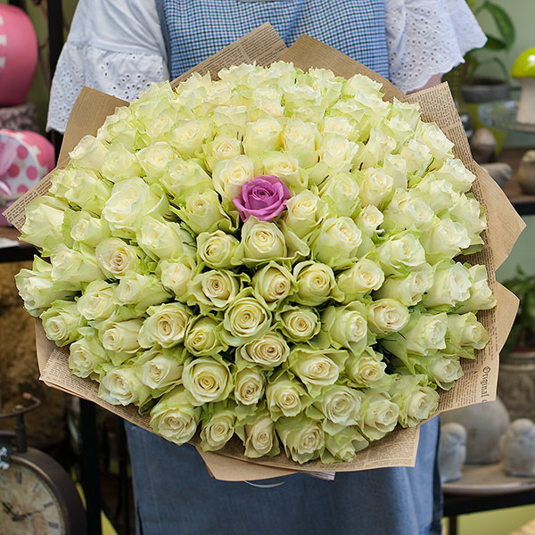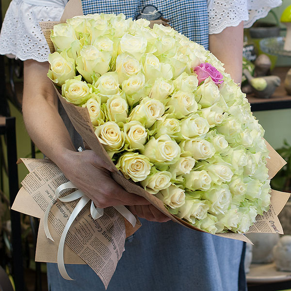 Букет из коротких кенийских роз 101 роза (100 белых и 1 розовая) в бумаге крафт.