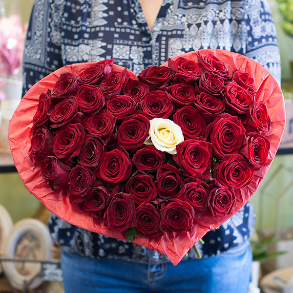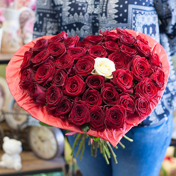 Букет в виде сердца из сорока красных роз и одной белой розы.