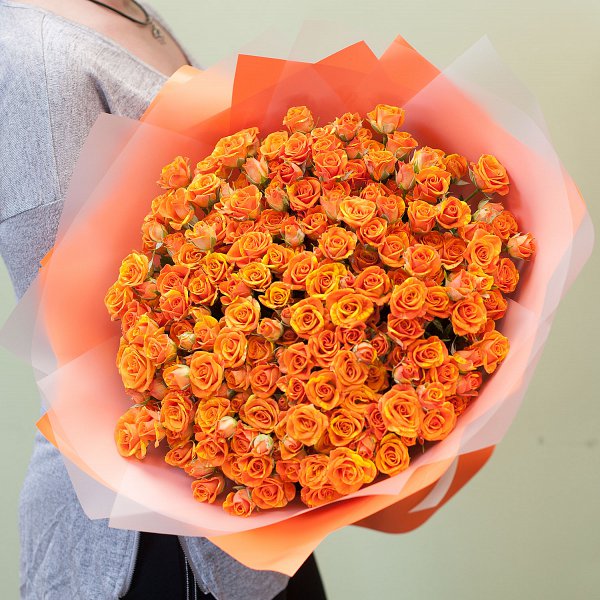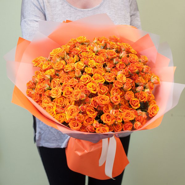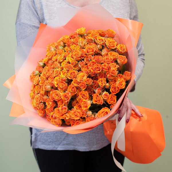 Букет из 51-ой оранжевой кустовой розы в подарочной упаковке.
