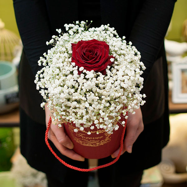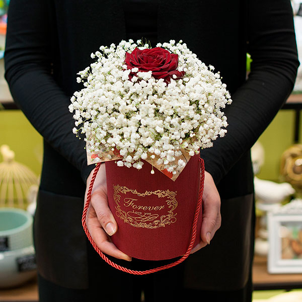 Композиция из белой гипсофилы и красной розы в небольшой шляпной коробке. Доставляется по Москве и Санкт-Петербургу.