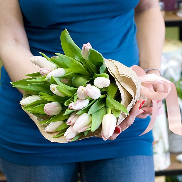 Букет из нежно-розовых тюльпанов 15 шт в бумаге крафт.