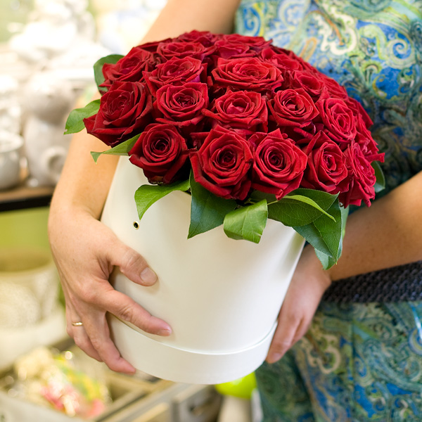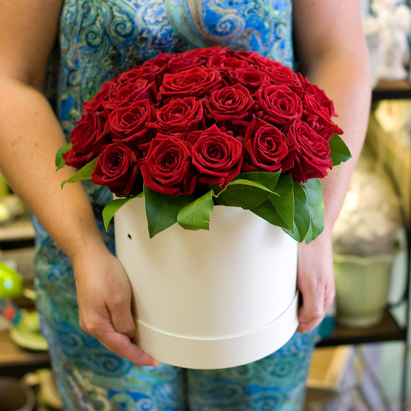 Шляпная коробка с красными розами (25 роз)