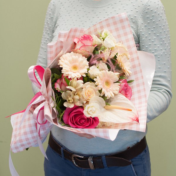 Букет цветов в нежных тонах из роз, кустовых роз, фрезий , альстромерии, антуриума с декоративной зеленью в дизайнерской упаковке.
