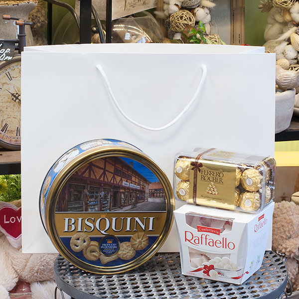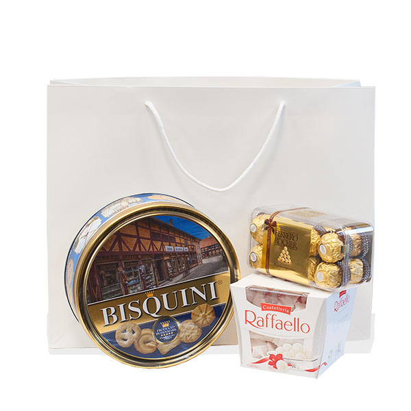 Подарочный пакет: датское печенье в ж/б 400 гр., конфеты Fererro Rocher 200 гр, конфеты Rafaello 150 гр.