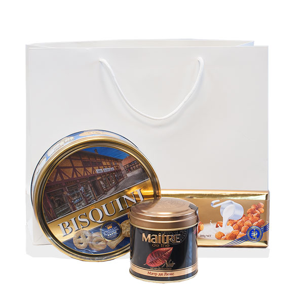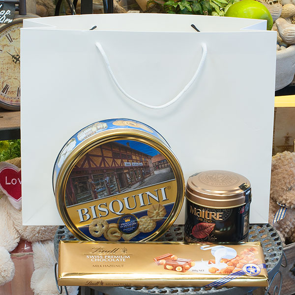 Подарочный пакет: датское печенье в ж/б 400 гр., черный чай в ж/б, плитка шоколада Lindt 250 гр.