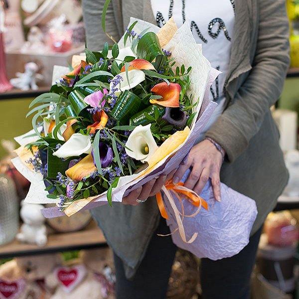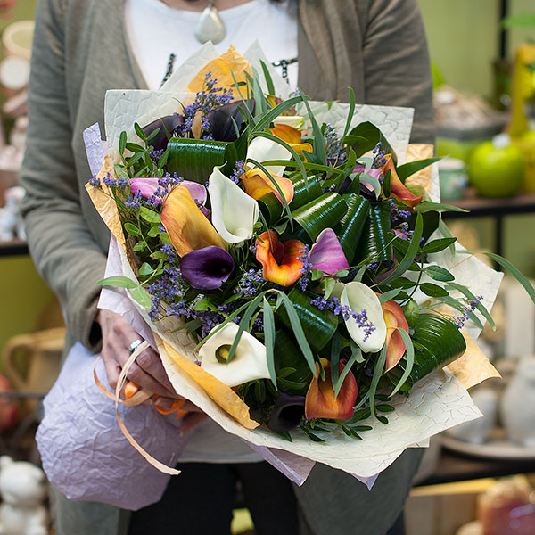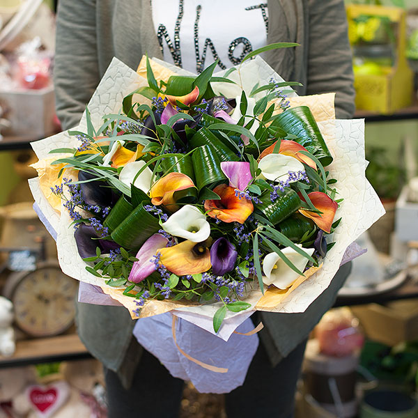 Букет из разноцветных калл, сиреневово лимониума с декоративной зеленью: аспидистра, эвкалипт, писташ, салал,- оформленный в бумагу крафт и фетр.