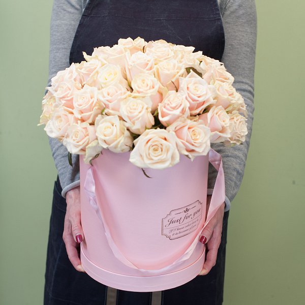 Композиция из кремовых роз в шляпной коробке.