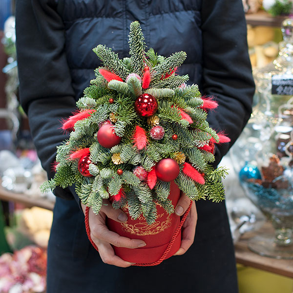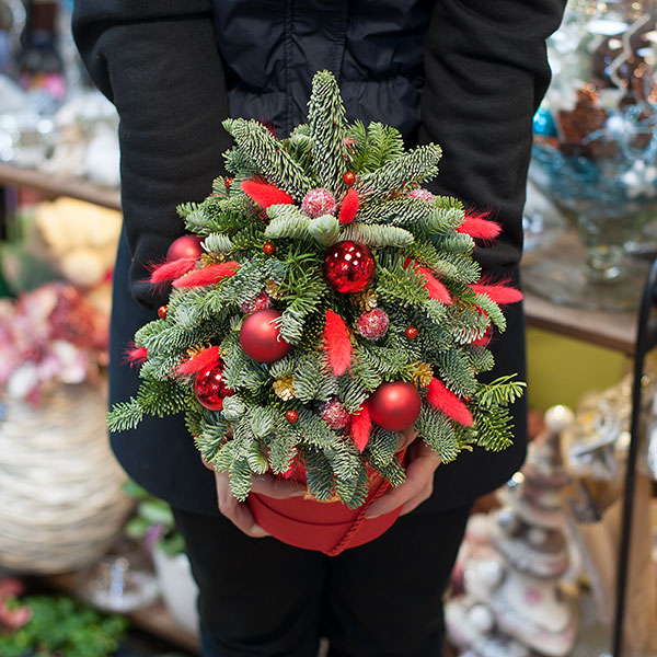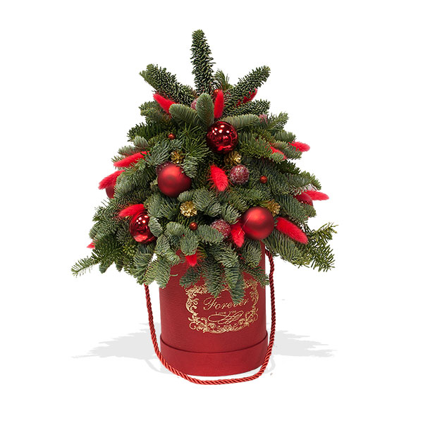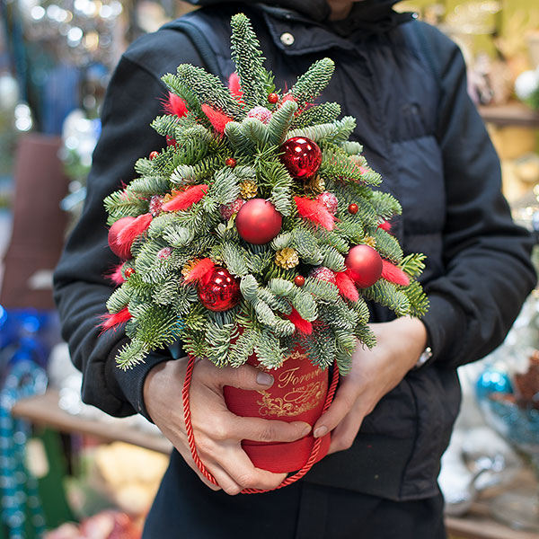 Елка ручной работы в красных тонах из елового лапника, шляпной коробки и новогодних игрушек. По Вашему желанию цветовую гамму композиции можно изменить, для этого звоните в наши салоны цветов или указывайте в разделе "комментарии для флориста" при заказе через интернет.