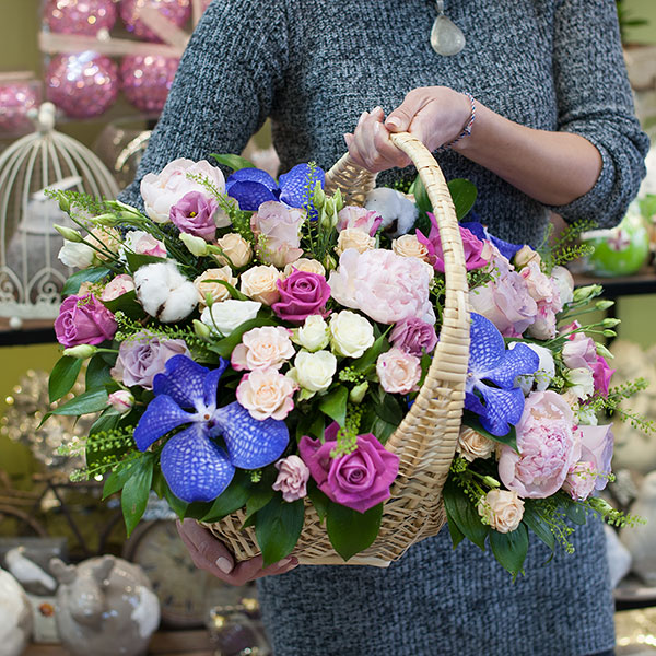 Корзина в сиренево-розовых тонах из орхидей Ванда, ярких роз Аква, нежных кустовых роз, белых лизиантусов, сиреневых роз, декоративной зелени грин белл, розовых пионов, хлопка с декоративной зеленью. По Вашему желанию цветовую гамму композиции можно изменить, для этого связывайтесь с нашими операторами по телефону или указывайте в разделе "комментарии для флориста" при заказе через интернет.