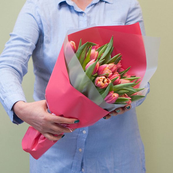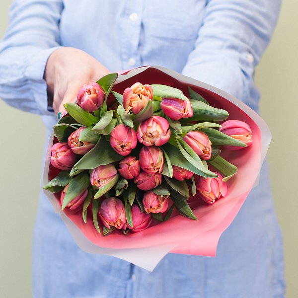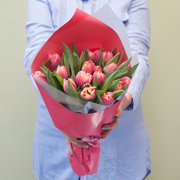 Букет из 19-ти пионовидных тюльпанов в дизайнерской упаковке.