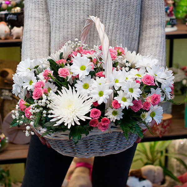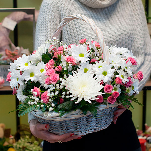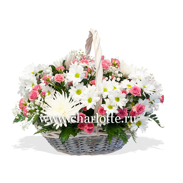 Корзинка в бело-розовой гамме из хризантем кустовых и одноголовых, и кустовых роз с декоративной зелень. По Вашему желанию цветовую гамму композиции можно изменить, дя этого звоните в наши салоны цветов или указывайте р разделе "комментарии для флориста" при заказе через интернет.