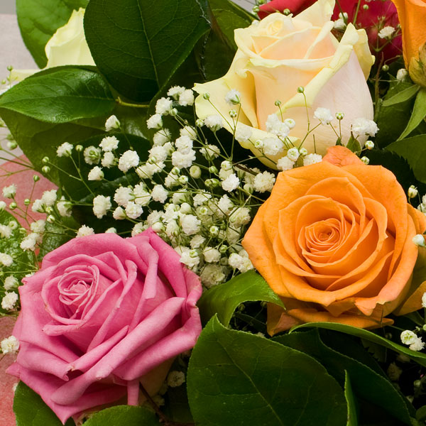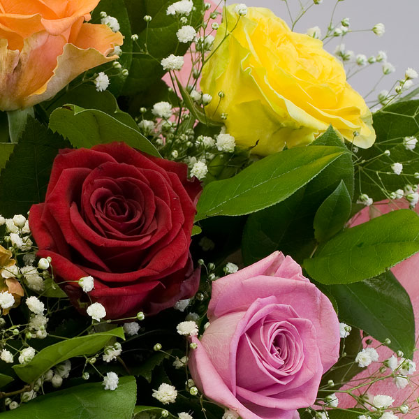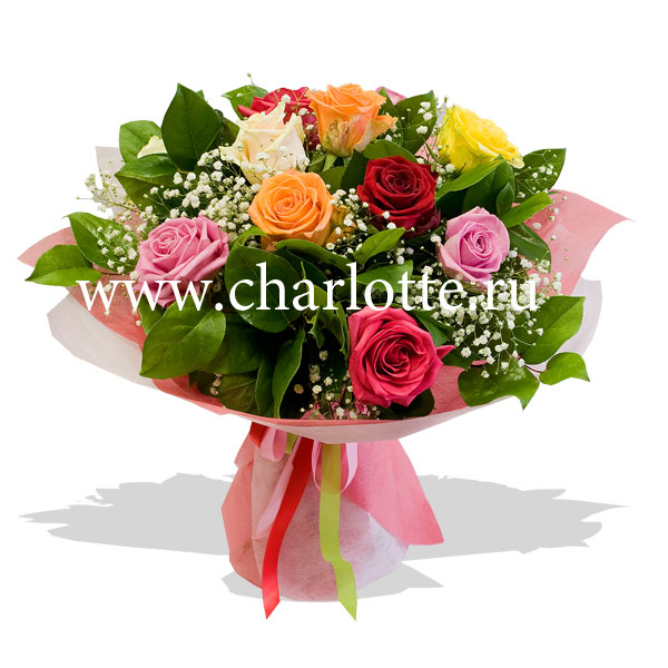 Букет из разноцветных роз, гипсофилы, зелени в подарочной упаковке.