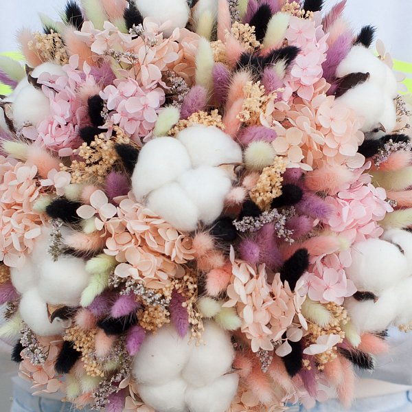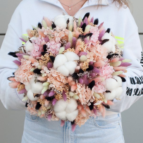 "Масатан" состоит из стабилизированных цветов, что обеспечивает его долговечность и сохранность внешнего вида на протяжении длительного времени. В состав композиции входят гортензии, хлопок и лагурус, что придает ей уникальный и привлекательный вид.
