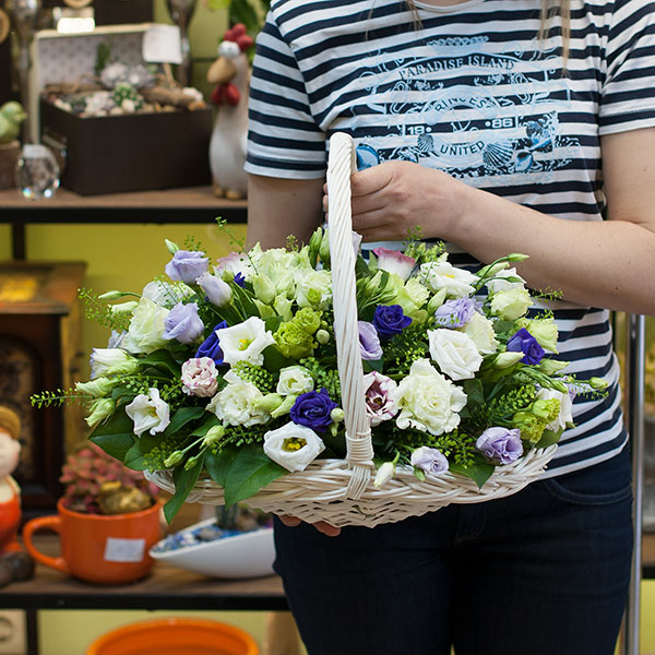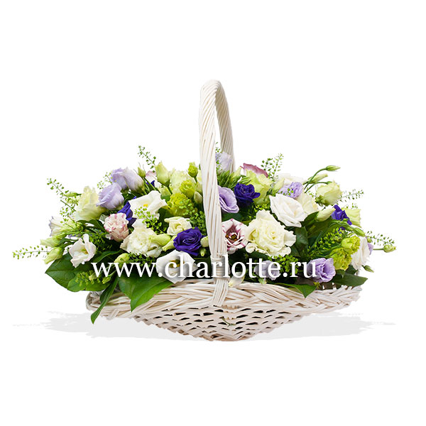 Корзинка из разноцветных лизиантусов с зеленью грин белл, а так же другой зеленью. По Вашему желанию цветовую гамму композиции можно изменить, для этого звоните в наши салоны цветов или указывайте в разделе "комментарии для флориста" при заказе через интернет.
