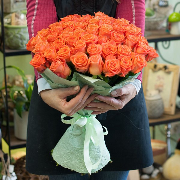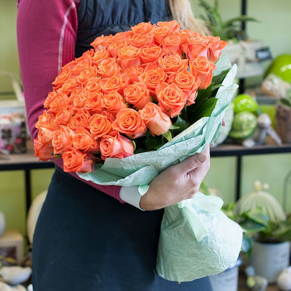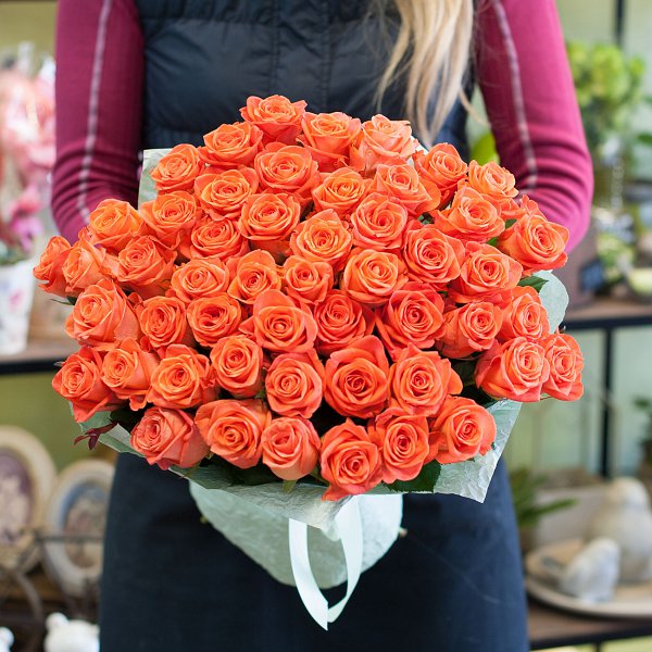 Букет из 51-й ярко-оранжевой розы 50 см сорта Вау в подарочной упаковке.
