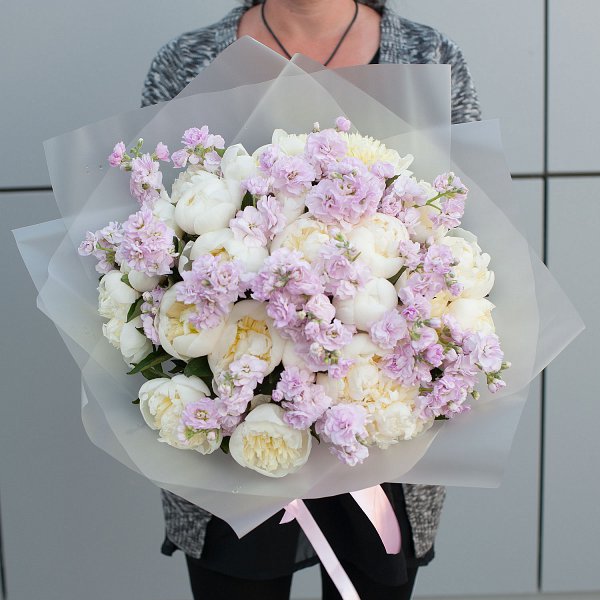 Букет состоит из 25 цветов, включая пионы и маттиолу. Эти цветы символизируют любовь, нежность и заботу, что делает букет еще более привлекательным.