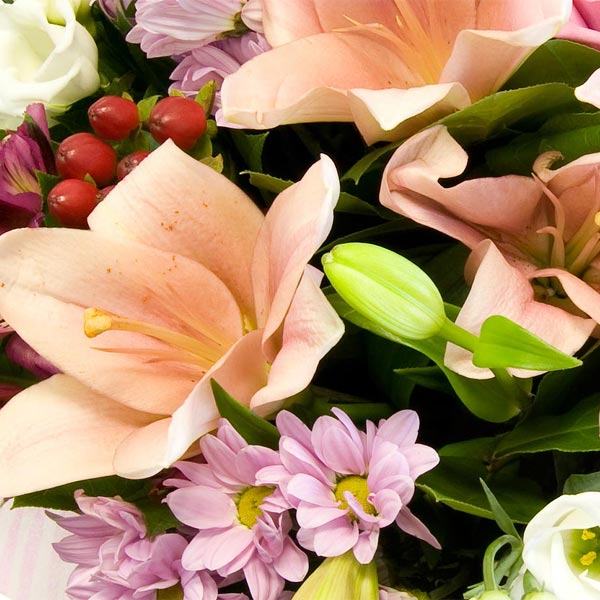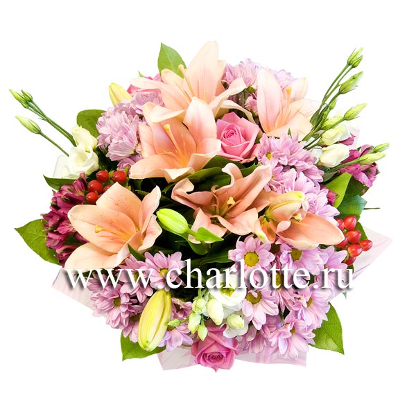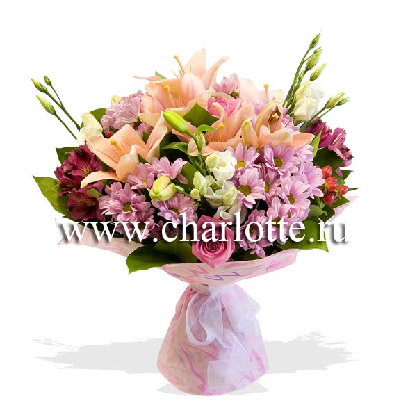 Букет в розовых тонах из лилий, роз, лизиантусов, хризантем, гиперикума с декоративной зеленью. Цветы оформляются в подарочную упаковку на усмотрение нашего флориста. Если Вы хотите изменить цветовую гамму букета, звоните в наши салоны цветов или указывайте в разделе "комментарии для флориста" при заказе через интернет.