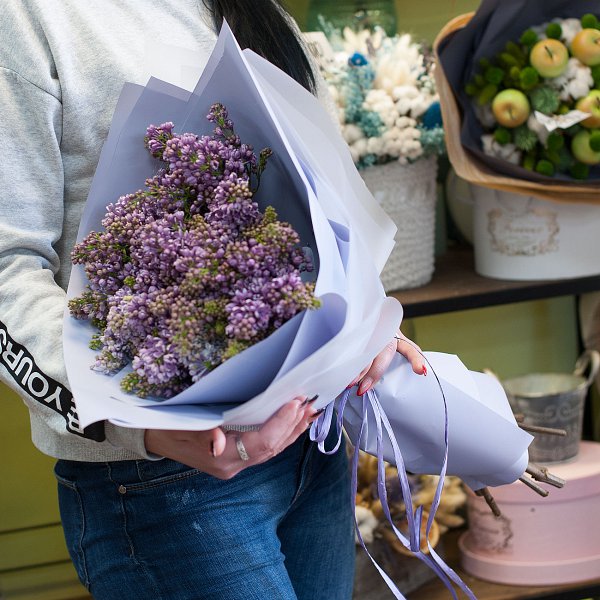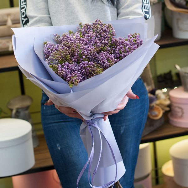 Букет из 11 веток сиреневой сирени в подарочной упаковке.