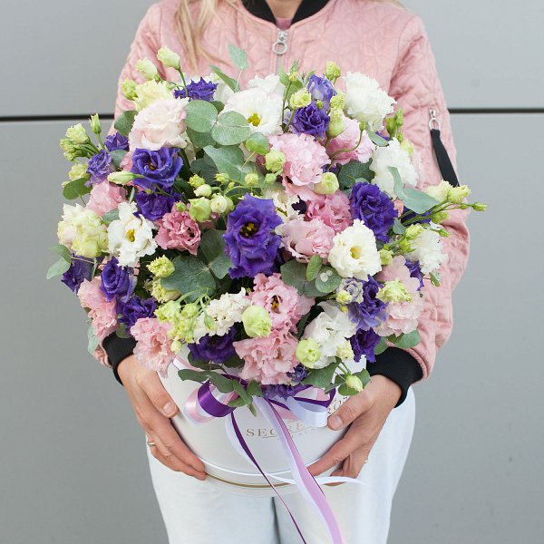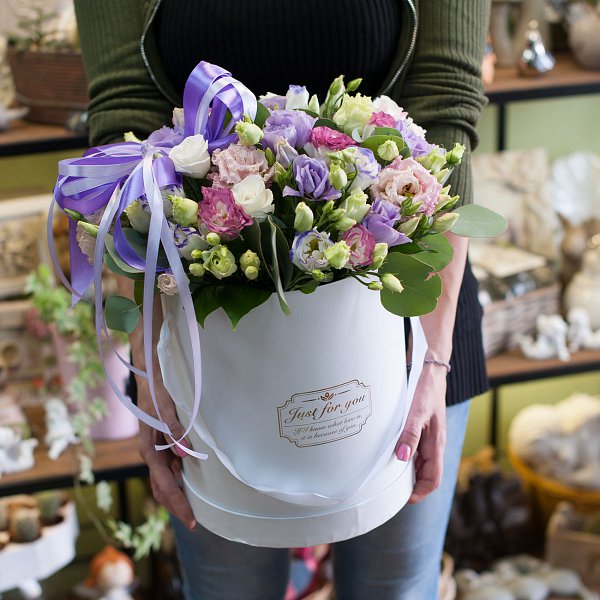 Шляпная коробка Charlotte "Лизиантусы" с 17 цветами и зеленью в коробке станет отличным подарком для любого случая.