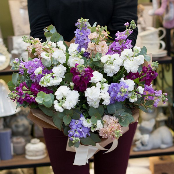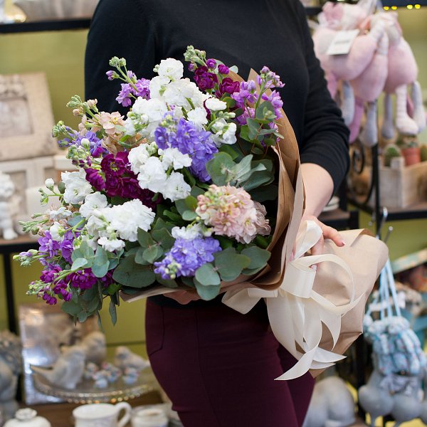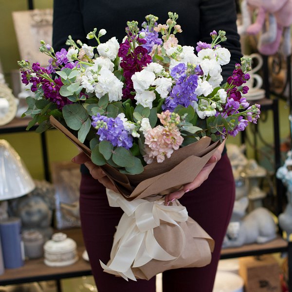Букет из разноцветной матиоллы (15 шт) с эвкалиптом в дизайнерской бумаге крафт.