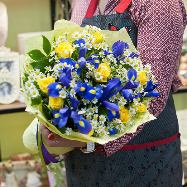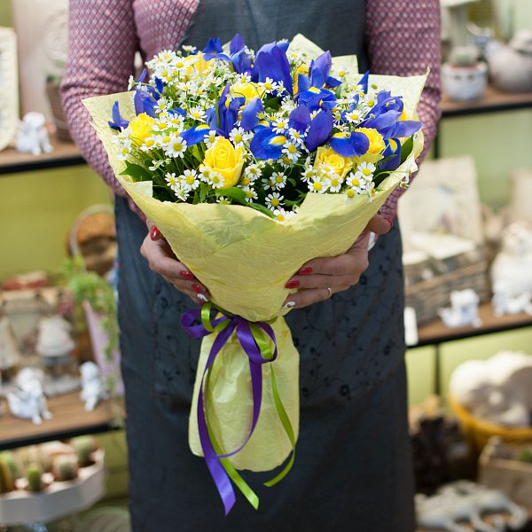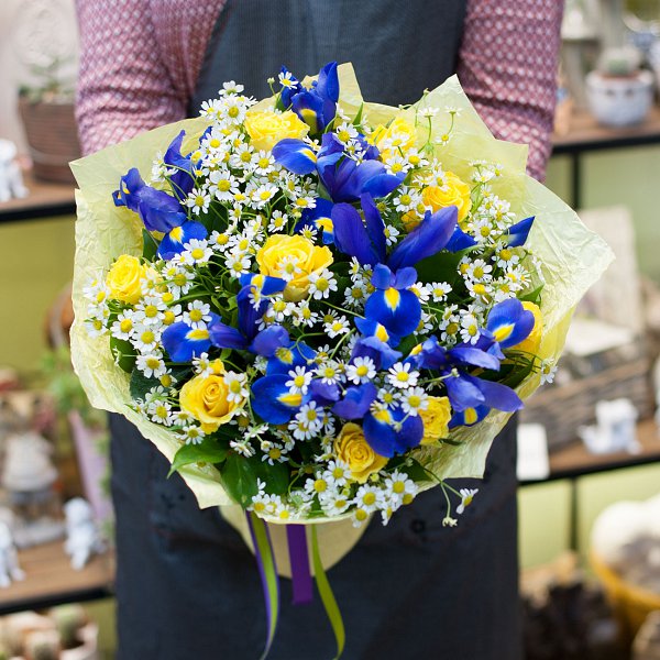 Букет состоит из желтых роз, синих ирисов и ромашек кустовых, что создает неповторимый и красочный образ. Декоративная зелень добавляет свежести и гармонии в композицию, делая ее еще более привлекательной.