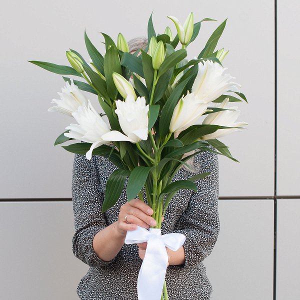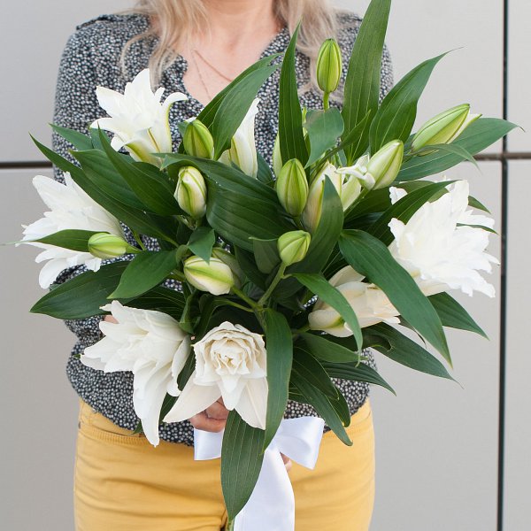 Букет состоит из 5 лилий белого цвета, что придает ему особую нежность и элегантность.