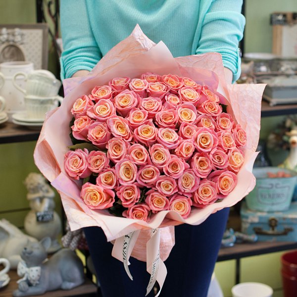 Букет из 51-ой персиковой розы в подарочной упаковке.