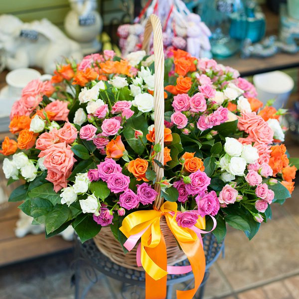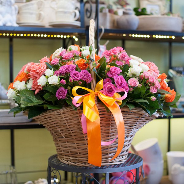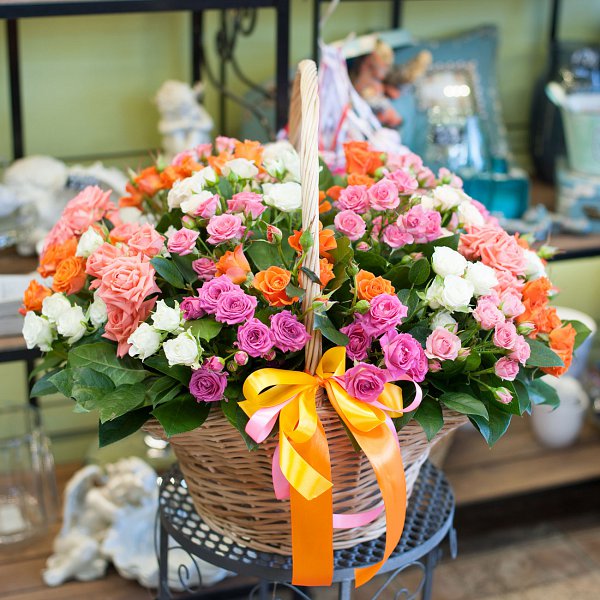 29-ть разноцветных кустовых роз с декоративной зеленью в корзине.