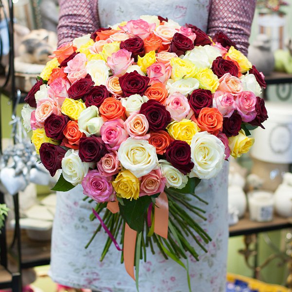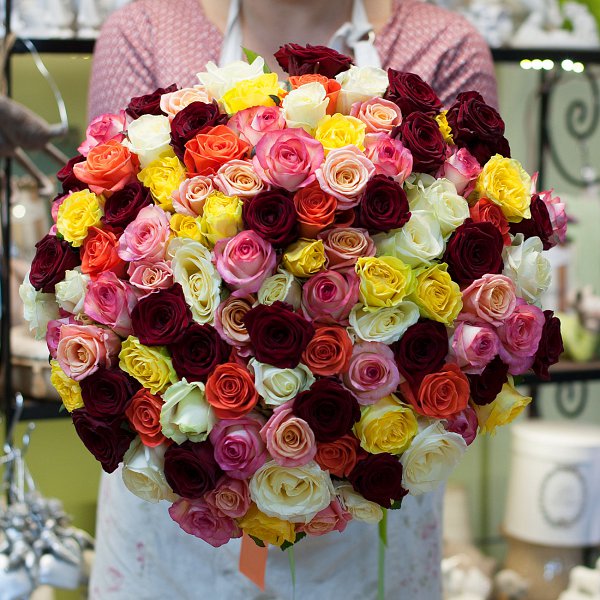 Букет из роз представлен в разноцветном исполнении, что добавляет ему яркости и выразительности. В составе букета 101 роза, каждая из которых уникальна и неповторима.