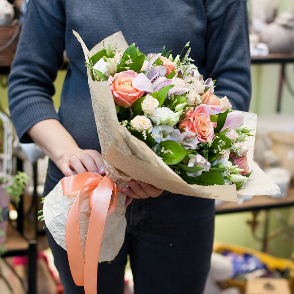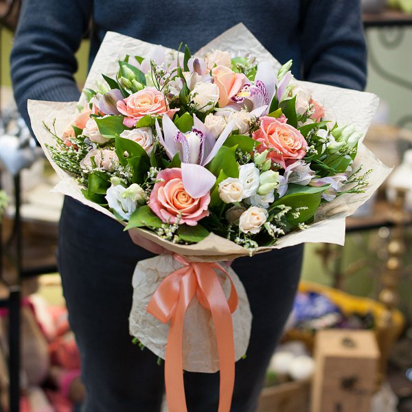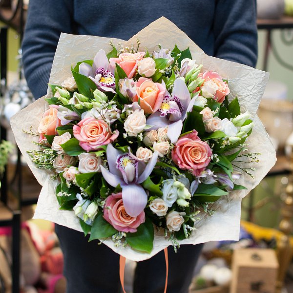 Букет из роз, кустовых роз, белого лимониума, лизиантусов, альстромерий с декоративной зеленью в подарочной упаковке.