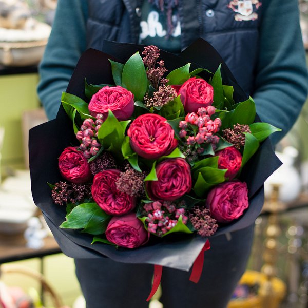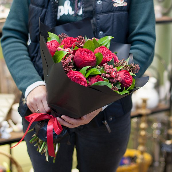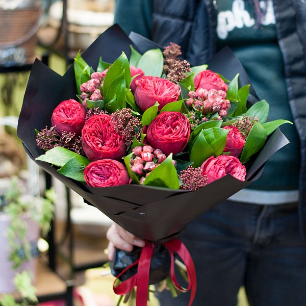 Букет из роз "Пиана" - это дизайнерский букет, который сочетает в себе красоту и изысканность пионовидных роз, скимии и бовардии с декоративной зеленью.