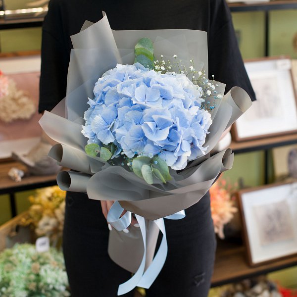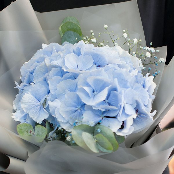 Букет в голубых тонах из гортензии, гипсофилы, эвкалипта в дизайнерской пленке с лентами.