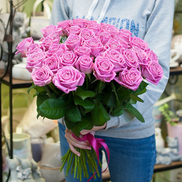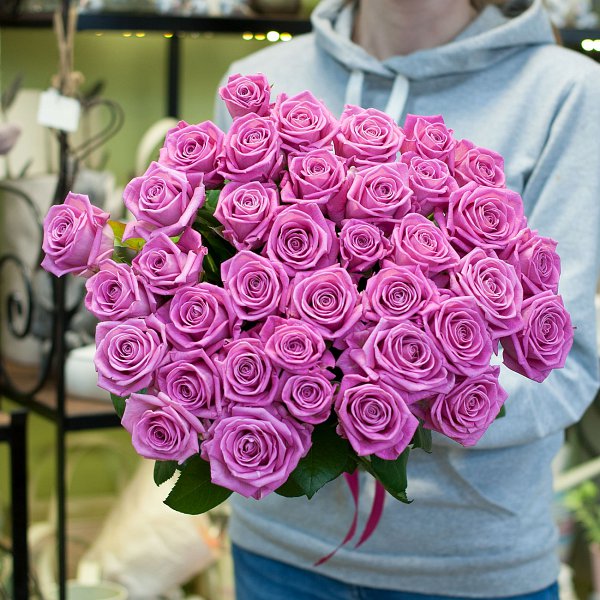 Букет состоит из 35 ярко-розовых роз сорта "Аква". Этот сорт роз отличается своей красотой и насыщенностью цвета, что делает его прекрасным выбором для любого случая.