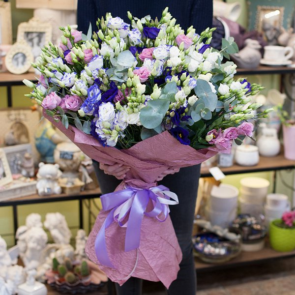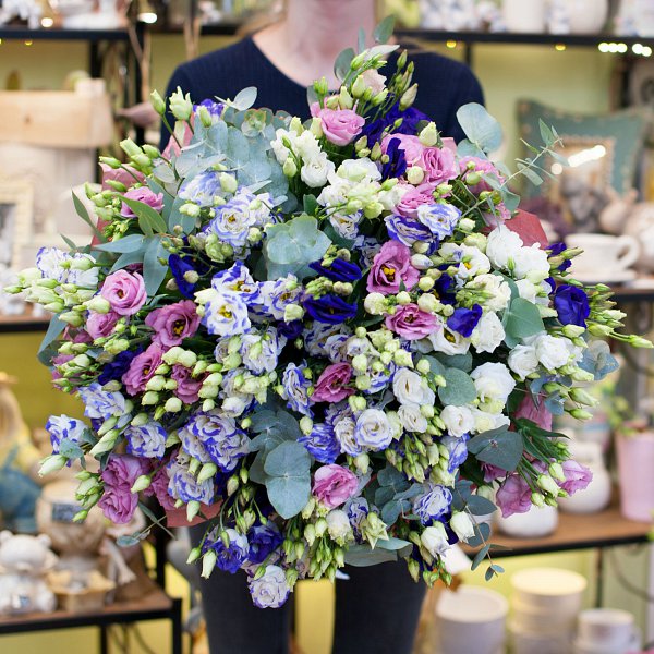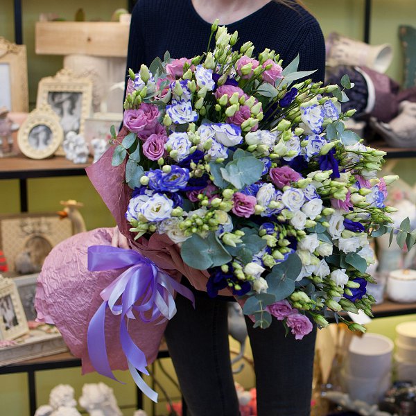 Букет из разноцветных лизиантусов (101 стебель) с эвкалиптом в красивой упаковке.