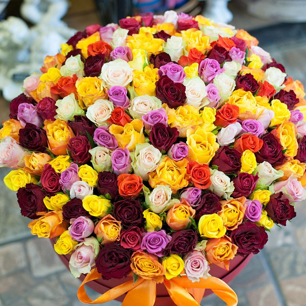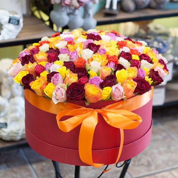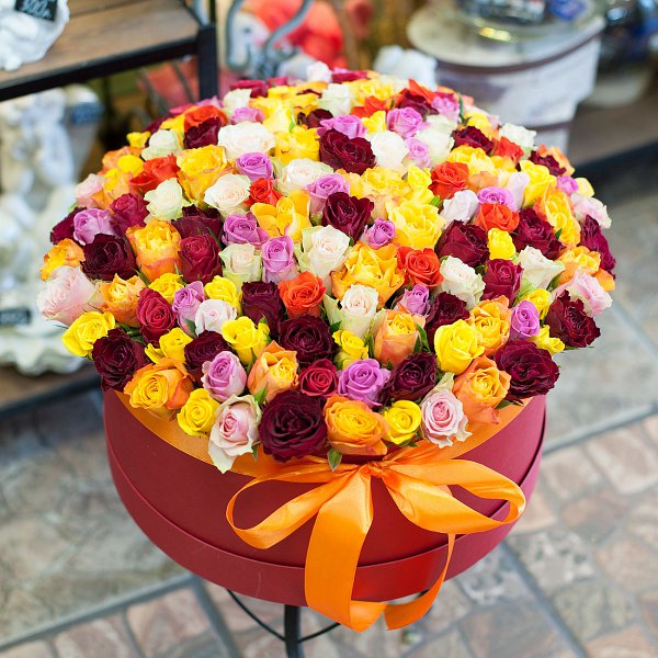 Шляпная коробка большого размера из разноцветных роз Кения (151 роза).