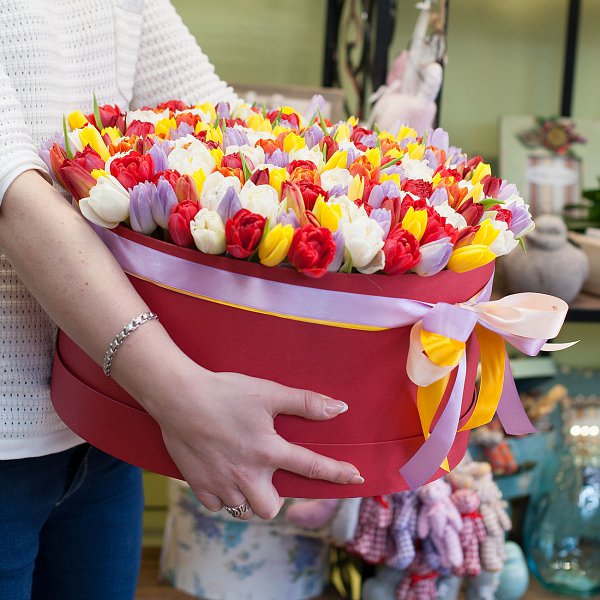 Тюльпаны в шляпной коробке – это композиция из 201 разноцветного тюльпана, которая будет радовать глаз своей красотой и свежестью.