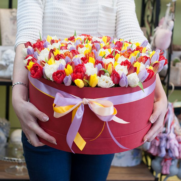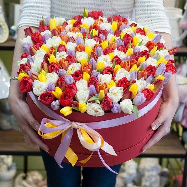 Тюльпаны в шляпной коробке (201 тюльпан)