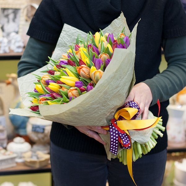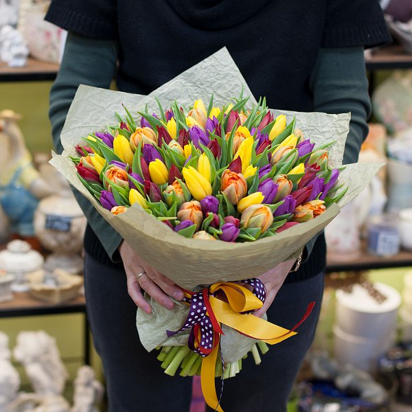 Букет из 101-го тюльпана (оранжевого, красного, фиолетового и желтого).