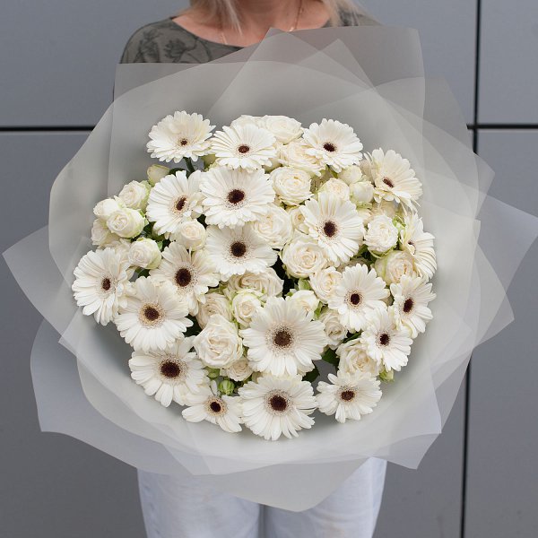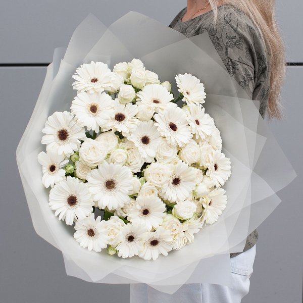 Букет в белой гамме из минигербер и пионовидных кустовых роз "Айс" - это стильный и элегантный выбор для любого повода.