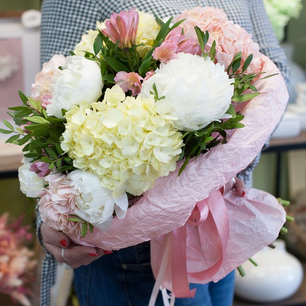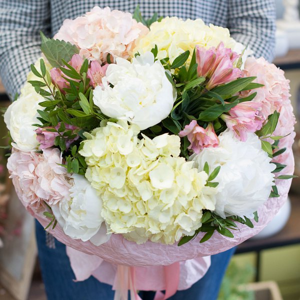 Букет из гортензий пастельных тонов, белых пионов, альстромерии с декоративной зеленью в подарочной упаковке.