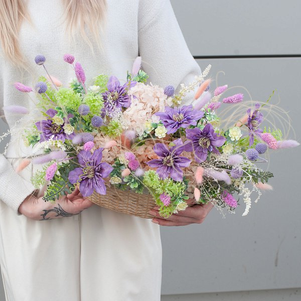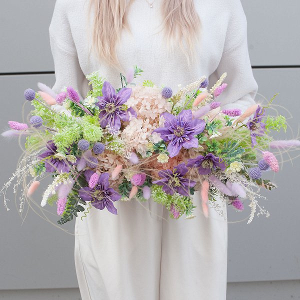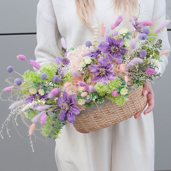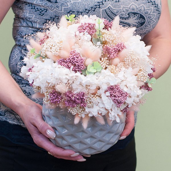 Композиция включает в себя различные виды сухоцветов, такие как гортензия, краспедия, лагурус, фалярис, гипсофила и озатамнус. Это позволяет создать яркий и насыщенный цветовой акцент в вашем интерьере.