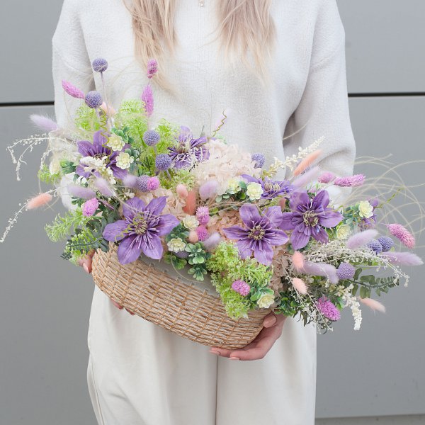 В состав композиции входят стабилизированные цветы, которые сохраняют свою свежесть и красоту на протяжении длительного времени. Это позволяет наслаждаться их видом в течение многих месяцев, не беспокоясь о том, что они завянут или потеряют свой первоначальный вид.