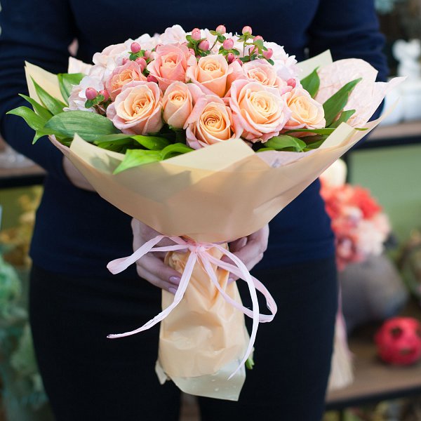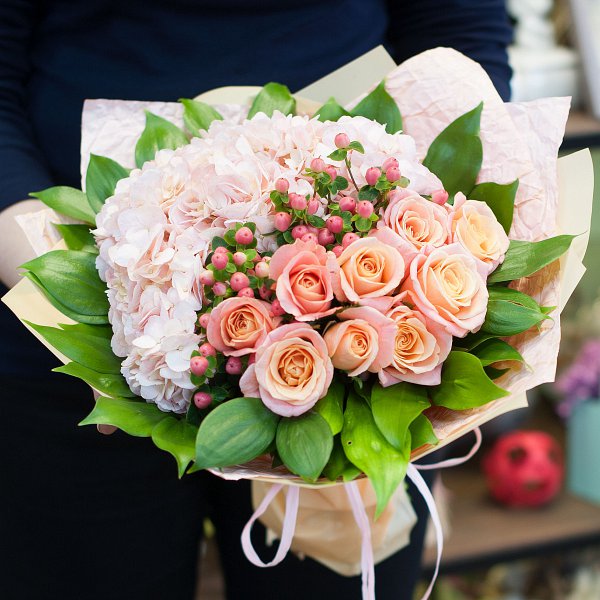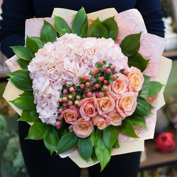 Букет в персиковых тонах из роз, гортензий, гиперикума с деоративной зеленью в подарочной упаковке.