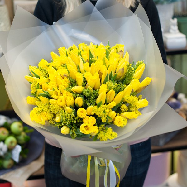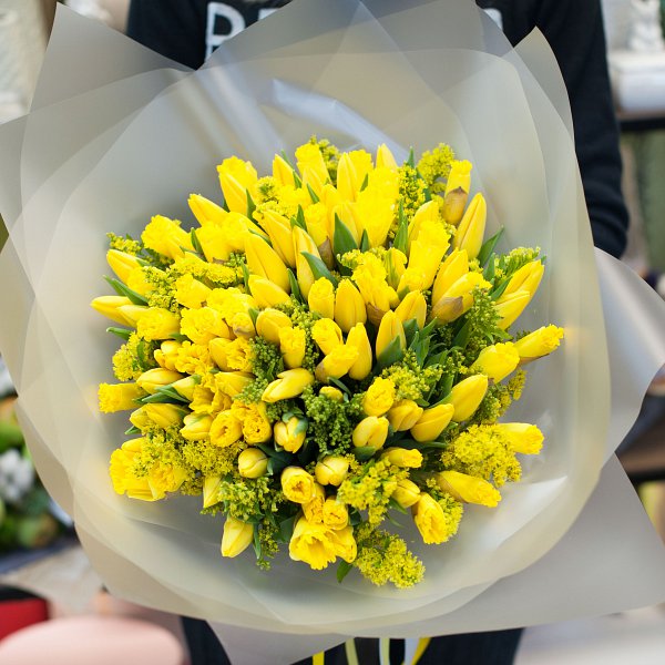 Букет цветов "Spring sun" - это уникальное сочетание ярких и ароматных тюльпанов и нежных нарциссов. Эти цветы, собранные в дизайнерской пленке, создают неповторимую атмосферу весеннего солнца и тепла.